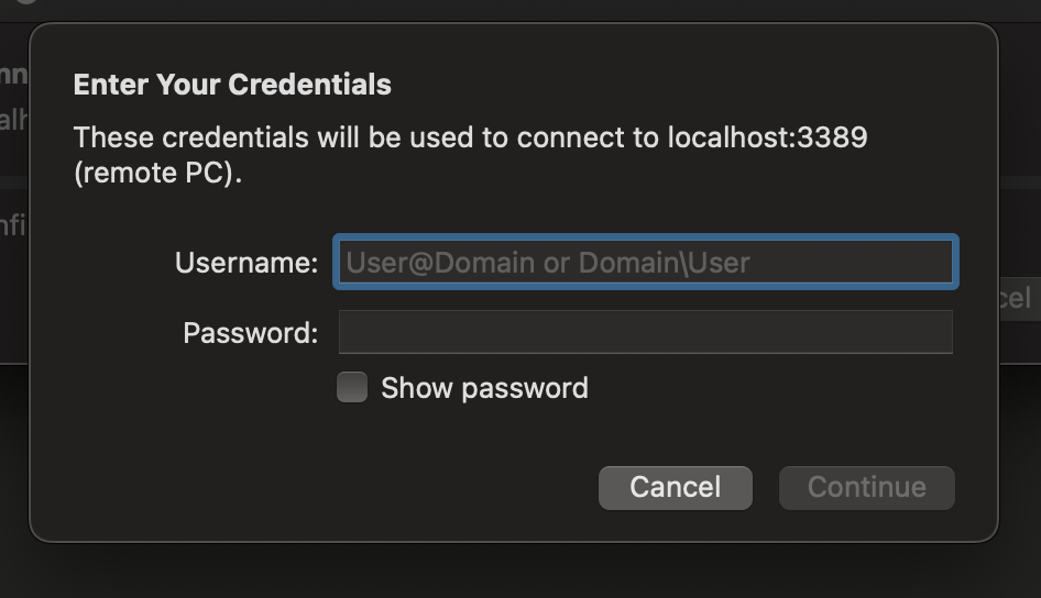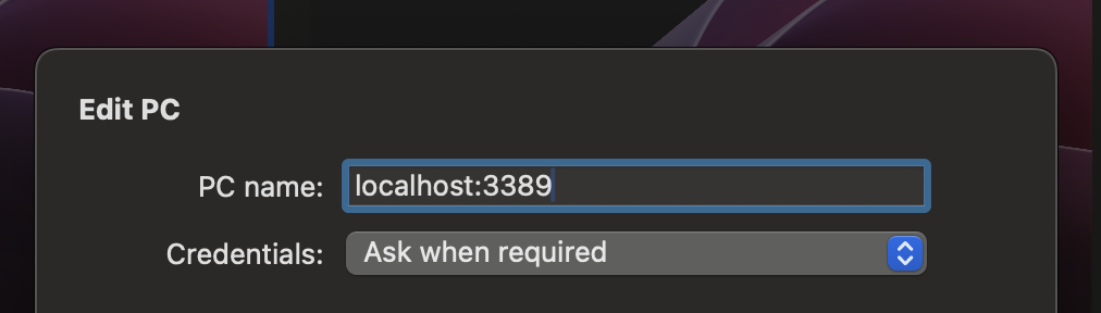 Go to your RDP client (MS Windows App in my case) and add a new device with hostname or IP address as localhost:3389.